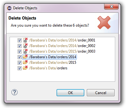 Resource nodes can be deleted from the resource tree of a checkout by selecting the resource node and pressing the Del key or opening the context menu and selecting the Delete action. The following confirmation dialog will pop up: